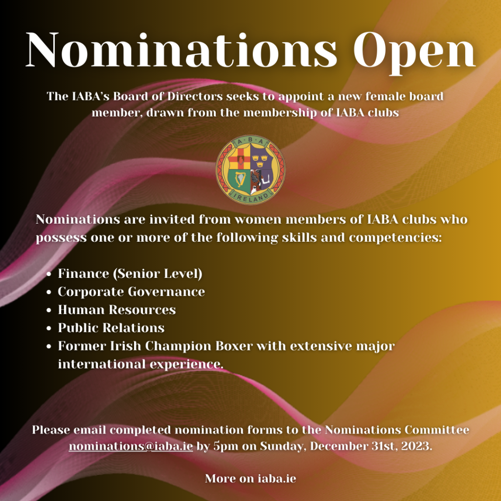 Please email completed nomination forms to the Nominations Committee nominations@iaba.ie by 5pm on Sunday, December 31st, 2023.