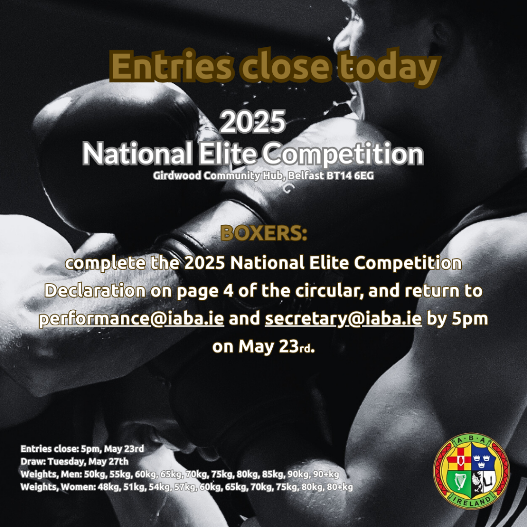 As the 2025 National Elite Competition form is a factor for team selection for international competition, all entrants must hold a current up to date Irish passport, with at least 6 months remaining to expiry. Please note that boxers born in Northern Ireland may choose to identify themselves as Irish or British or both in accordance with the provisions of the Northern Ireland Act 1998 (more commonly known as the Good Friday Agreement).