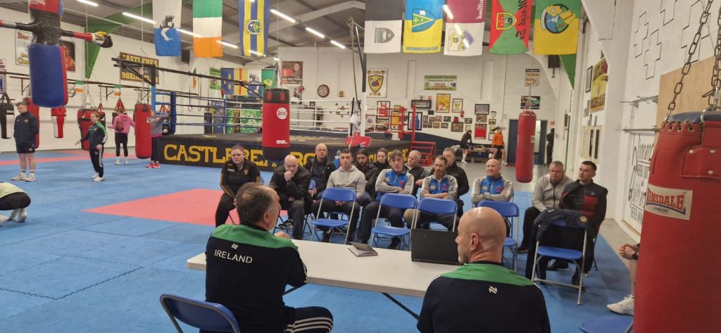This evening’s seminar, in which 14 coaches participated, involved a boxing technical presentation by High Performance Head Coach Zauri Antia and Coach, Damian Kennedy, observation of a High Performance school combat training session, and a Q&A.