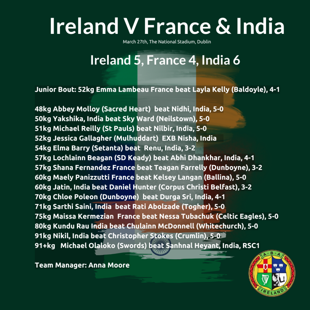 A scintilating evening of boxing in the first of this week’s two Youth Internationals has ended with 5 wins for Ireland, 4 for France and 6 for India.