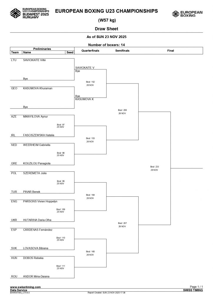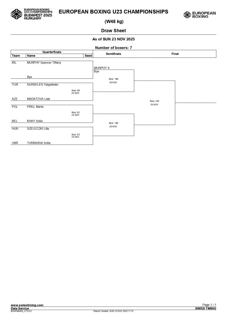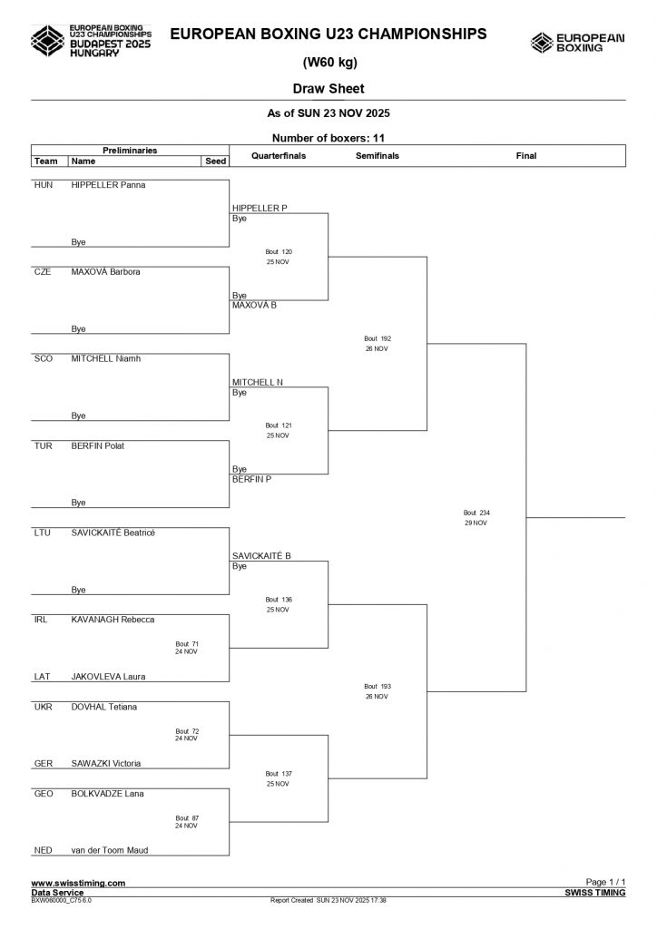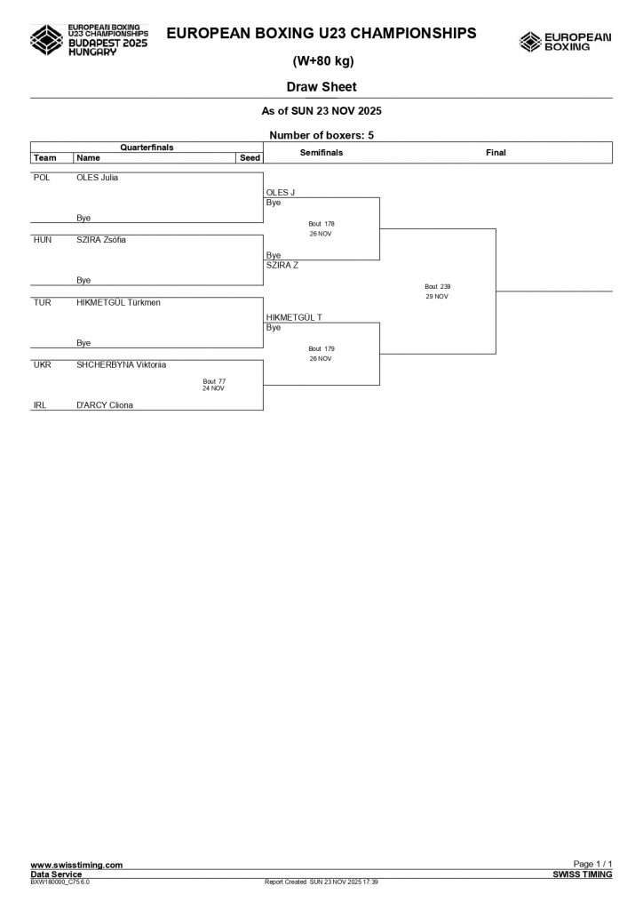 80+kg Cliona D’Arcy, Tobar Pheadair BC, Galway makes her tournament debut 6 contests later, in Bout 10 of the same ring and session. She boxers her quarter final against Ukraine’s Viktoriia Shcherbyna.