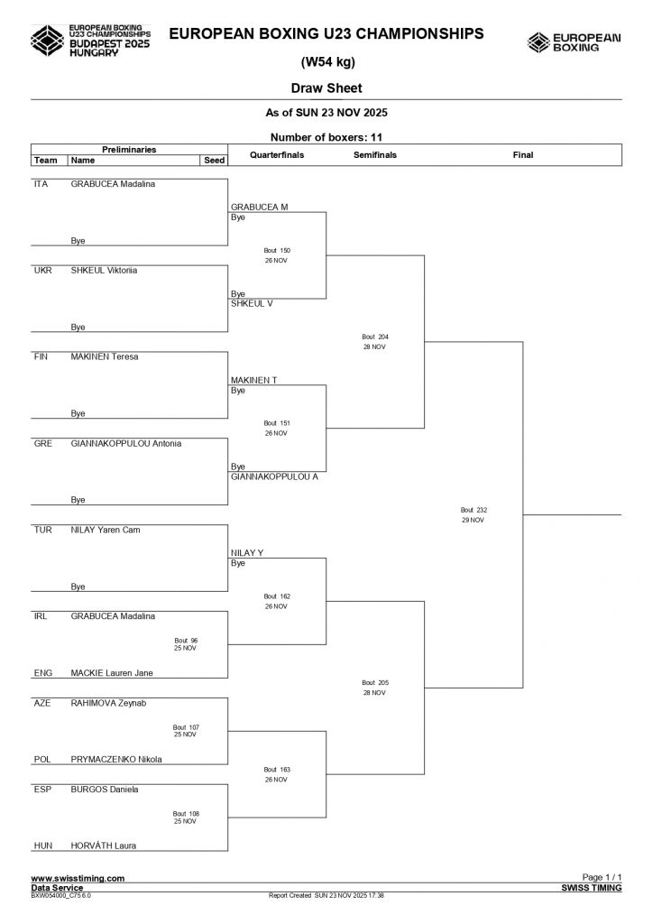 55kg Pasty Joyce, Olympic BC, Westmeath takes on Ukraine’s Maksym Zymenko, the 2024 European Youth Champion in a Last 16 contest. That’s Bout 1 of Ring A’s Afternoon Session.