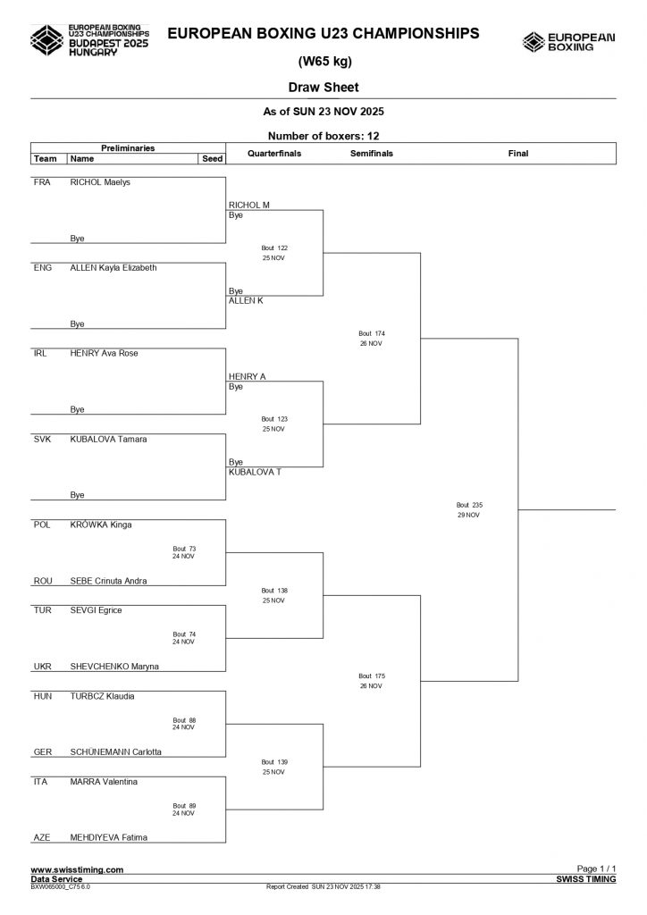 65kg Roy Colgan, Avona BC, Dublin has a bye to the Last 16 stage – he’ll open his account against Germany’s Denis Bril on Monday in Bout 5 f Ring A’s Afternoon Session.