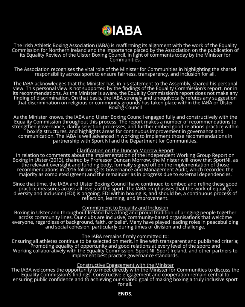 The IABA welcomes the opportunity to meet directly with the Minister for Communities to discuss the Equality Commission’s findings. Constructive engagement and cooperation remain central to ensuring public confidence and to achieving our shared goal of making boxing a truly inclusive sport for all.