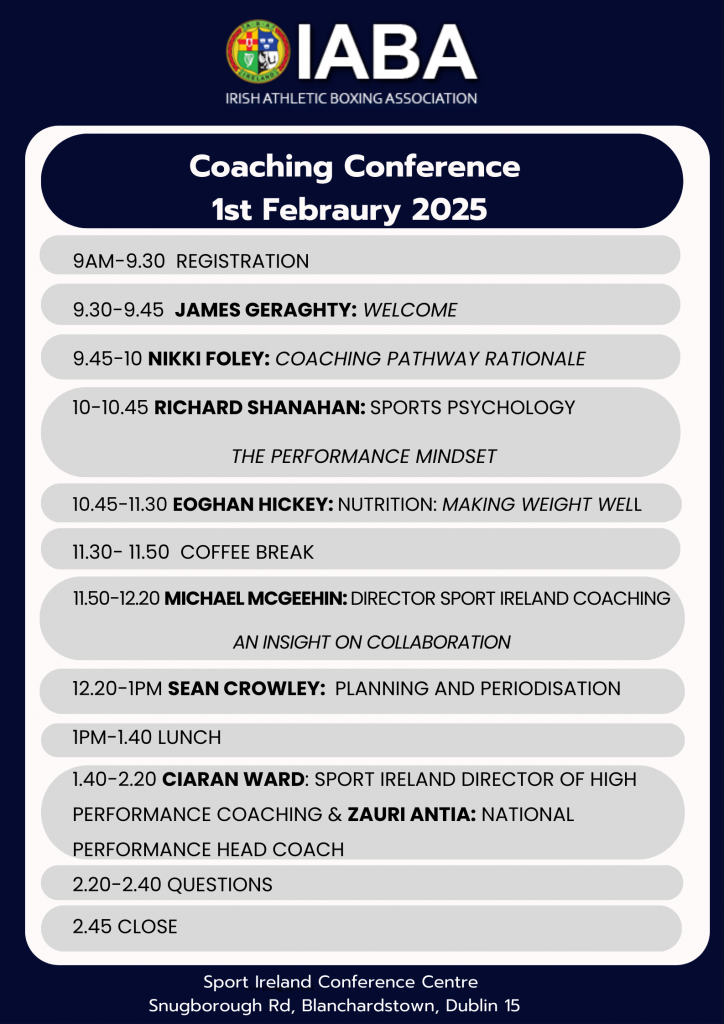 The first IABA conference of 2025: On the Front Foot – Setting Boxers Up for Success, will take place on Saturday. Two speakers have been added: SI Director of High Performance Coaching, Ciaran Ward and SI Director of Coaching Michaeal McGeehin.