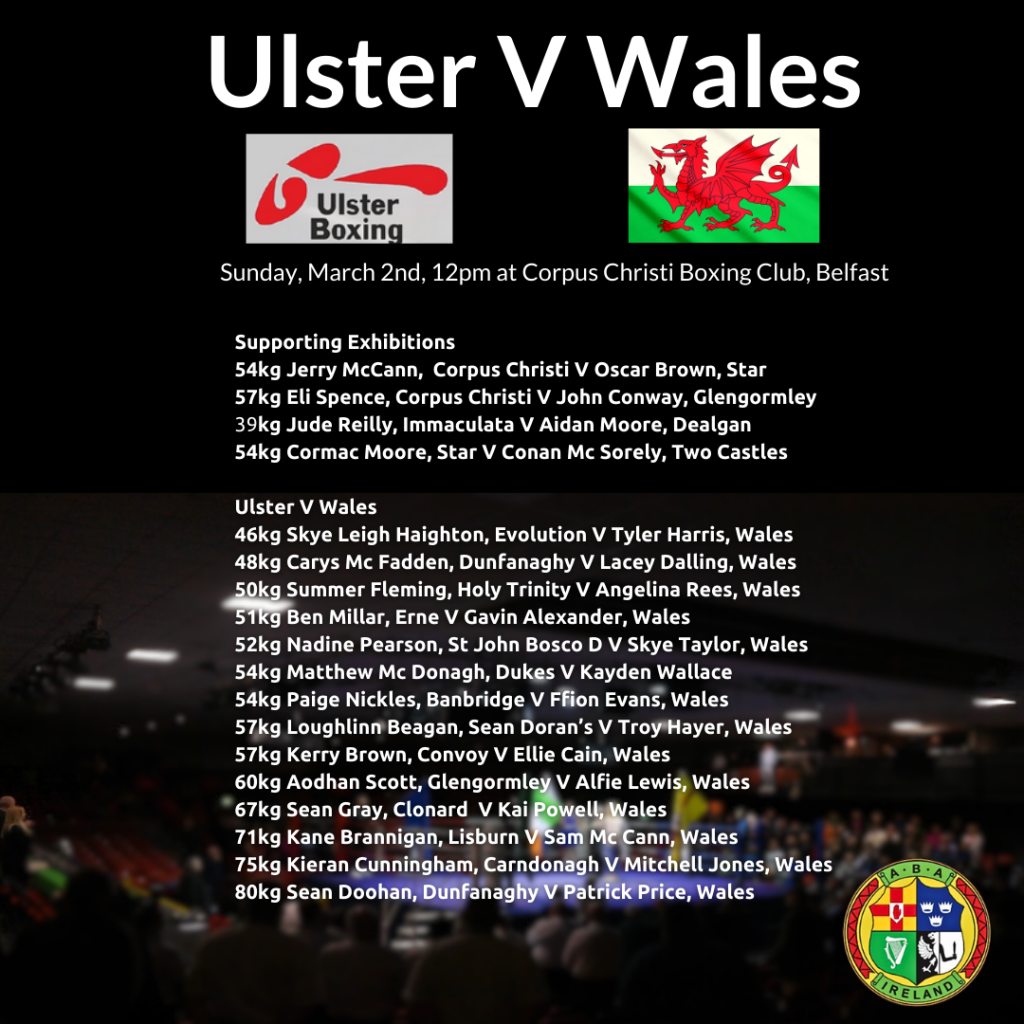 Team Wales will travel from the Guildhall to Corpus Christ Boxing Club Belfast on Sunday March 2nd, for a series of development-focused exhibition bouts.