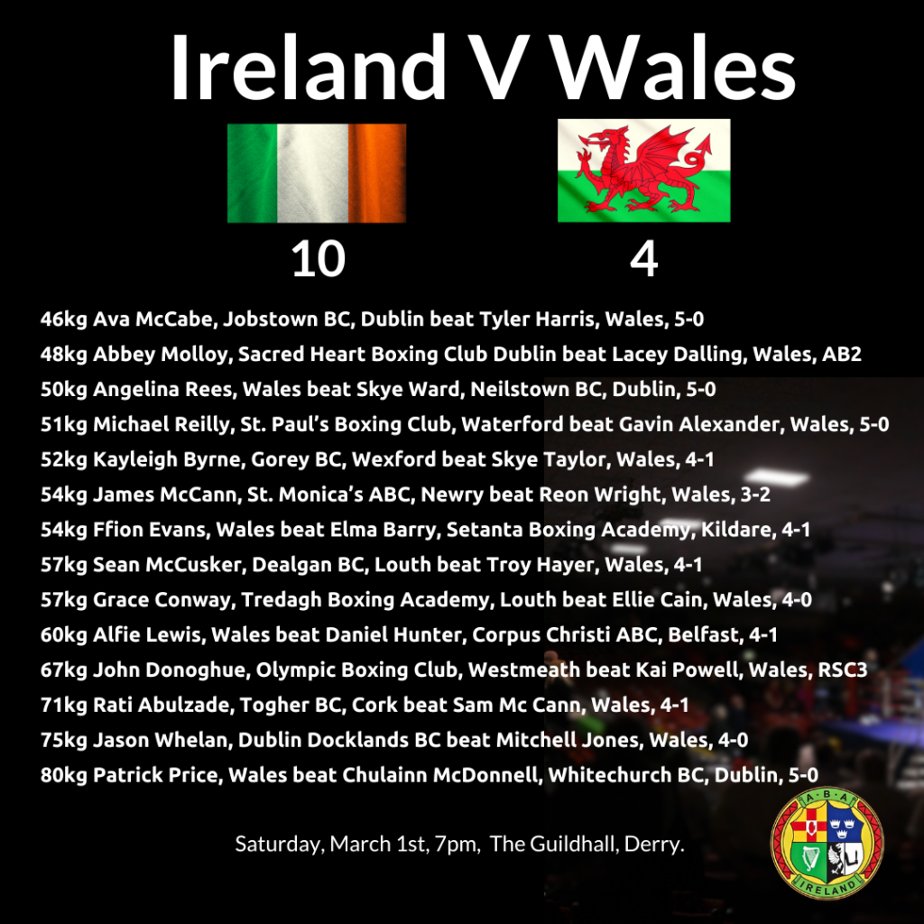 This international is kindly supported by Derry Credit Union, Tyrone and Fermanagh County Board Board and Donegal County Boxing Board